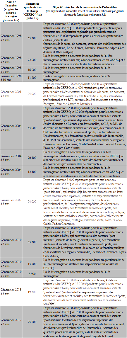 L’annexe présente le nombre de répondants par enquête, en distinguant la cible relevant de l’échantillon du CEREQ de celles relevant des extensions d’échantillon.