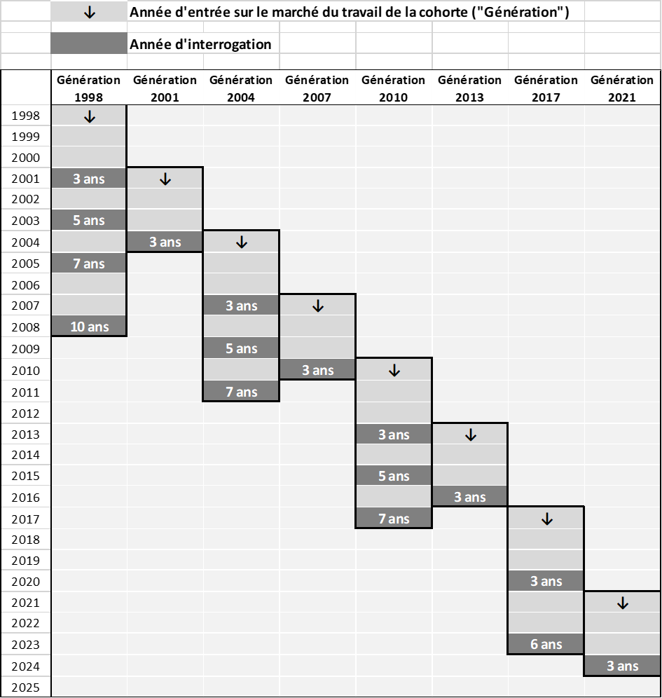 Le dispositif s’appuie enfin sur le constat que l’insertion prend du temps. L’accès à l’emploi à durée interminée, qui reste une norme d’emploi, est rarement immédiat. Aussi, les répondants sont-ils enquêtés avec du recul. De la « Génération 1998 » à la « Génération 2013 », une nouvelle cohorte de sortants est interrogée tous les trois ans, trois ans après leur sortie de formation initiale. Une cohorte sur deux fait l’objet de deux ré-interrogations ultérieures pour disposer d’un parcours sur cinq ans, puis sept ans. La « Génération 1998 » a même fait l’objet d’une dernière interrogation dix ans après la sortie de formation initiale. Cette alternance de cohortes « légères », à l’échantillon plus réduit, et de cohortes « pleines », avec des échantillons plus importants, permet de répondre à la fois à une demande de résultats synthétiques récents et de données permettant des analyses structurelles plus détaillées et sur une plus longue période.