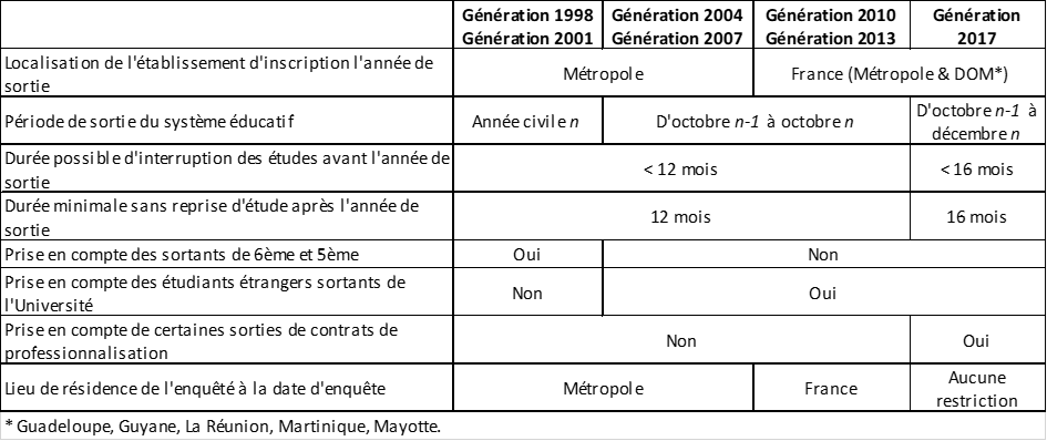 La façon de définir plus précisément ces critères a évolué dans le temps. Le tableau 1 présente ces évolutions. En particulier, l’allègement des contraintes techniques s’imposant à la collecte ont permis d’élargir le champ géographique des établissements couverts de façon à intégrer les départements d’outre-mer. Les restrictions pesant sur le lieu de résidence de l’enquêté au moment de la collecte ont aussi été progressivement allégées. L’évolution des politiques publiques et des comportements a aussi conduit à des modifications, notamment la prise en compte de la possibilité d’une année de césure à partir de la « Génération 2017 ».