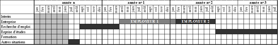 Le « calendrier d’activité » constitue le cœur du questionnaire, à la première interrogation et aux suivantes pour les cohortes interrogées plusieurs fois. Il décrit l’évolution de la situation d’activité de l’enquêté de sa sortie de formation initiale à la date d’enquête : les périodes d’emploi, les périodes de recherche d’emploi, les périodes de reprise d’études, les périodes de formation et les périodes dans une autre situation. Le schéma 2 présente un exemple de calendrier renseigné.