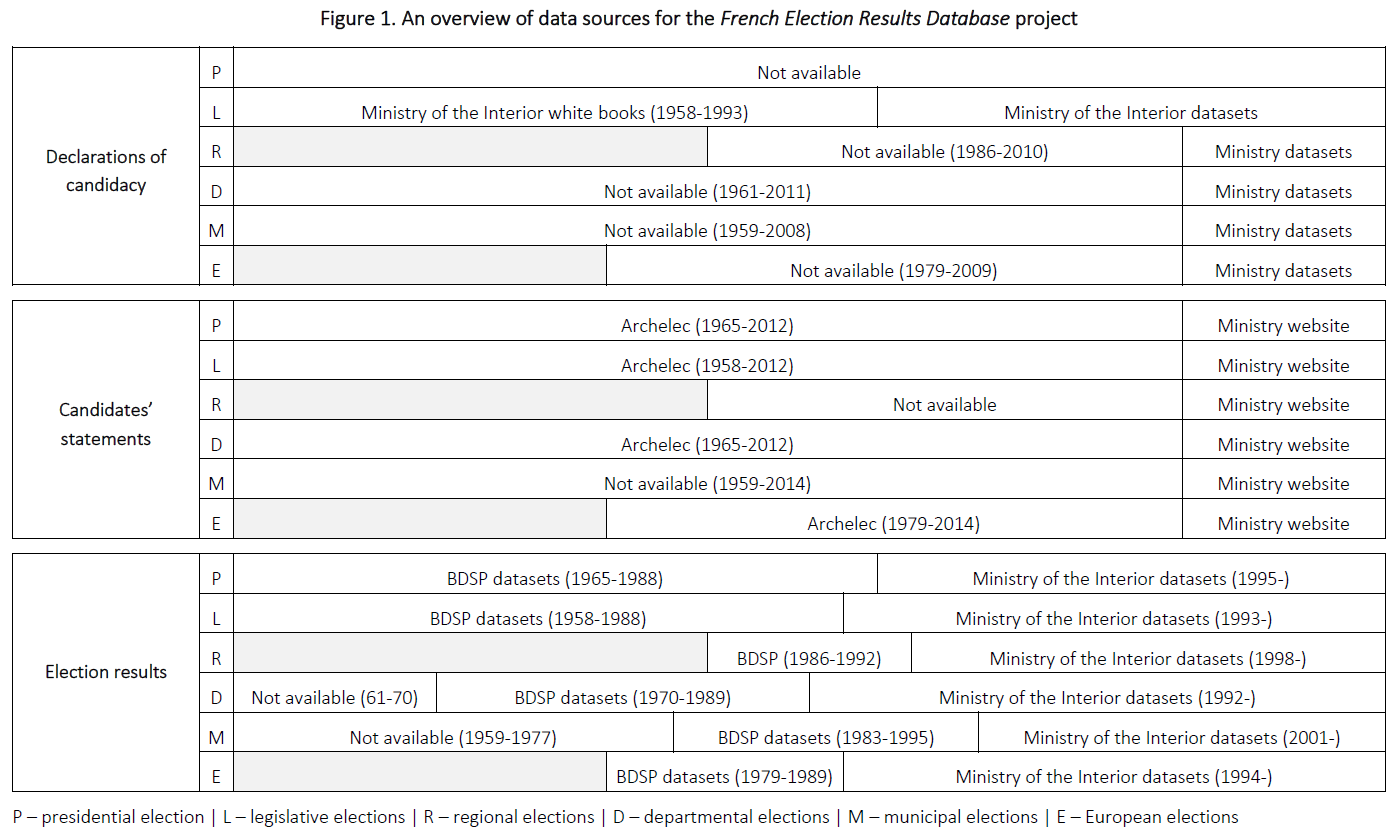 The FERD project is based on six different types of data: declarations of candidacy filed by candidates, declarations of affiliation to groups with regard to the public organization of political life, official party nominations, candidates’ personal statements, information on candidates published in the press, and voting results collected by the Ministry of the Interior. In this first part, I describe these types of data, explain how they are obtained and detail how the information gathered is processed. These data are not available and/or relevant for all elections: figure 1 specifies for which elections they are used.