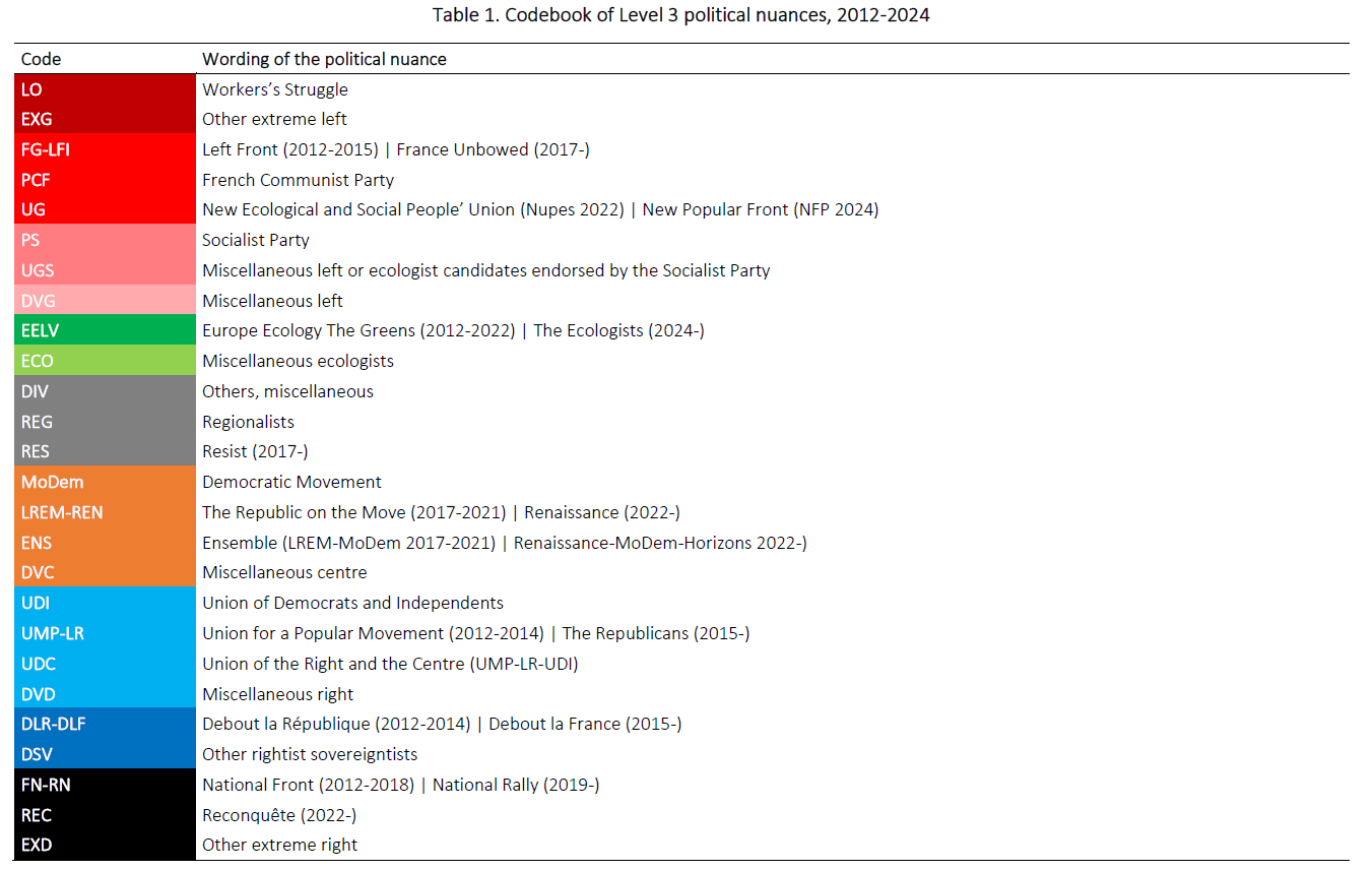 The general principle of Level 3 political nuances is to simplify level 2 nuances. In this way, level 3 codes have a single form: NUANCE. These codes are also intended to last over time and to represent a large number of candidates over several elections. For example, over the period 2012-2024, the Level 3 codebook includes 25 codes covering all national, local and European elections (Table 1). These codes are listed from left to right.