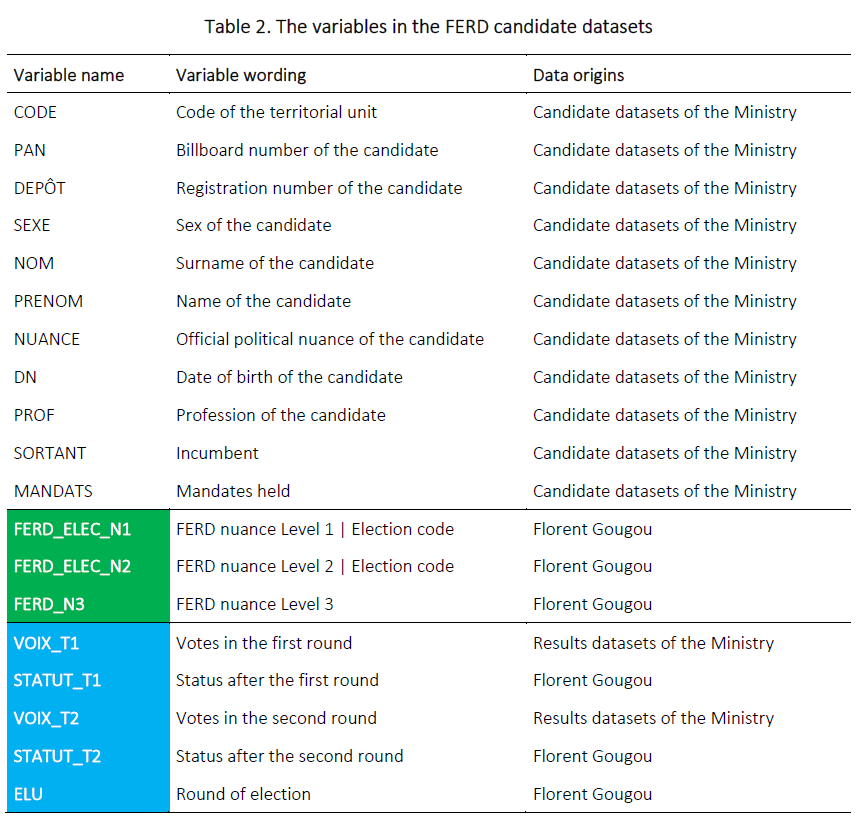 The FERD candidate files take over and enhance the structure of the candidate files computed by the Ministry of the Interior. All the variables initially included in the Ministry’s file are kept as they are: billboard number, registration number, sex, surname, name, official political nuance assigned by the Ministry, date of birth, profession and mandates held. Two other variables from the Ministry’s results files are added: the number of votes in the first round and (where applicable) the number of votes in the second round. The new variables added as part of the project are of two types. The first type is the political nuances according to the three coding levels: for each candidate, there are Level 1, 2 and 3 shades. The second type is the status at the end of each round of election: a status at the end of the first round (qualified, eliminated, defeated, elected), a status at the end of the second round (withdrawn, defeated, elected) and, in the event of victory, the round of election where it occurred.