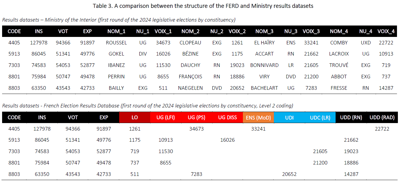 The FERD results datasets include the number of registered voters, the number of voters, the number of blank votes, the number of invalid votes and the number of votes cast as published in the Ministry of the Interior results datasets but modify their structure to make them directly usable. Table 3 shows how the FERD and the Ministry datasets are structured, using four legislative constituencies in the first round of the 2024 legislative elections as illustrations.