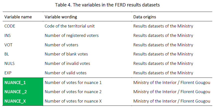 Since the 2014 municipal elections, the results files compiled by the Ministry of the Interior have been published in the beginning of the week following election day on data.gouv. These are CSV files, in which each line corresponds to a territorial unit. Corrections may be made once reports drawn in each polling station are checked by the electoral commission. Information retained in the FERD project is taken from the file compiled by the Ministry of the Interior after corrections.