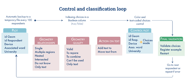 After each polygon had been drawn, the students were asked to use a word or expression (open question) to describe the area. This associated vocabulary was first corrected and harmonized orthographically in the original language, then translated into the project's two working languages (English and French). A control variable corresponding to the manual identification of the original language was added. In addition to this recoding, we proposed several forms of enrichment in order to categorize the designated spatial objects and to process them independently of the language used (Appendix 2).