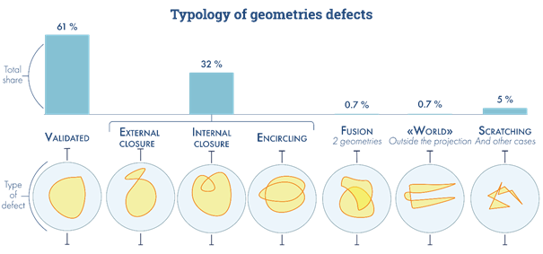 With a view to spatial analysis and cartographic production, we detected six topological problems (Figure 7) which required correction or reworking of the drawn polygons. The first, which includes three possible cases, is a problem of superimposition and crossing of contours, most often linked to the stage of closing the drawn area. Secondly, a number of polygons resembling scribbles (e.g. input tests), with no associated vocabulary, were detected and removed. The problem of the anti-meridian, a recurrent problem in geomatics (Gadomski, Hartzell, 2025), linked to the use of a cartographic projection, was identified for polygons encompassing the whole world. The topology of these contours has been corrected (for step by step information about geometries characterization, see the website associated with the database).