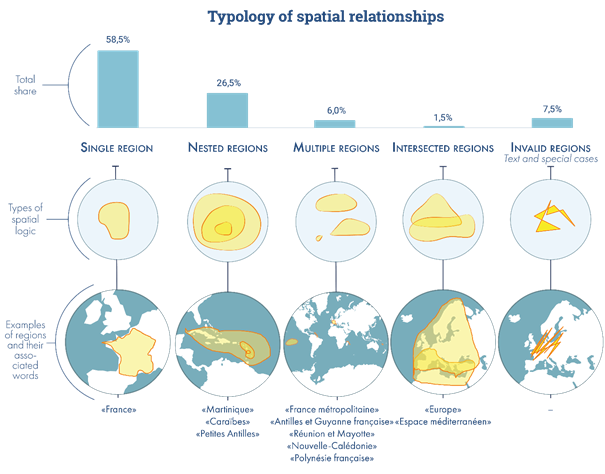 Grouping by "scale": This variable categorizes entities according to their scale (macro-regional, national, local, for example). This typology makes it possible to differentiate between objects that can be assimilated to macro-regions and other objects. It is important to note that not all identified objects have a scale.