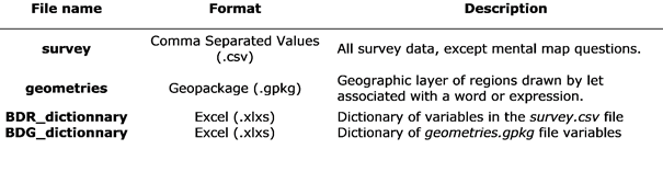 Like the raw data collected, the database made available is organized in two files. The first, called the "respondents database", includes all the variables collected, excluding the mental maps. The second, called the "geometries database", only contains the geographical data (mental maps) and associated vocabulary. These two data files have been processed and enhanced as described in the following sections.