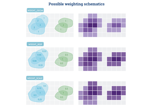 weight_scale: Each respondent has a weight of 1 and nested geometries have a shared weight (total weight of several nested polygons = 1)