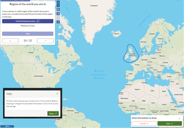 The innovation proposed as part of the IMAGEUN Student survey was to adapt this methodology, initially developed on paper (printed questionnaires incorporating one or more map backgrounds), by implementing it on a numeric medium. This enabled the survey to be quickly and massively distributed online, in order to meet the constraints of the Covid-19 pandemic (2019-2020), and also to collect geographical information directly digitized by respondents.