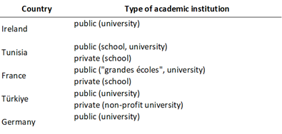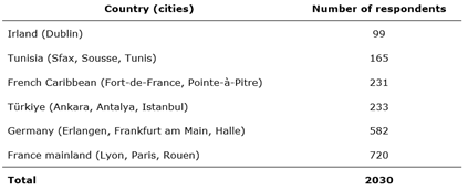The public surveyed (Table 1) was targeted so as to obtain, for each country, feedback from students in several disciplines, from institutions of varying status, adapted to each national or territorial context (public and/or private universities or schools, under contract or not) and located in cities of varying sizes5.