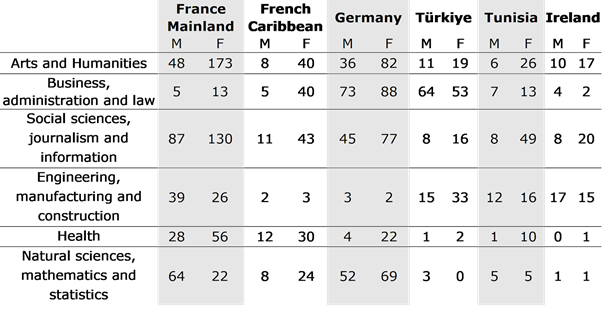 7 In terms of gender, the Tunisian and Caribbean cases stand out for the significantly higher participation of female students. For example, in the Martinique and Guadeloupe surveys, female students accounted for 80% of participants. This high proportion is similar to their university of enrolment, although higher (67% of women studying at the Université des Antilles in 2021/22, DataESR).