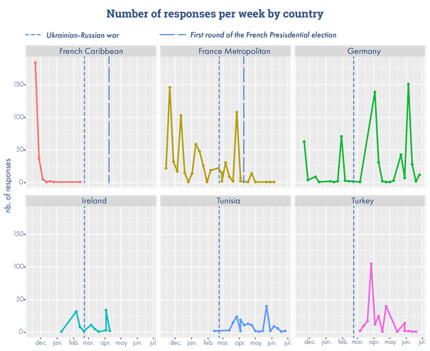 The survey was distributed over a period of eight months, between November 16, 2021, and June 30, 2022. The controls of the university ethics committees and difficulties encountered during distribution (hardware access, internet connection, absence of a project member on site) led to different collection times between the studied countries. This broad dissemination period is exposed to major national and international events which may have influenced the students' responses. It is worth mentioning in particular the start of the Russian-Ukrainian war in February 2022 or the French presidential elections in April 2022 (Figure 3).