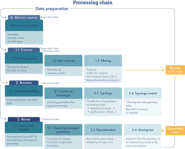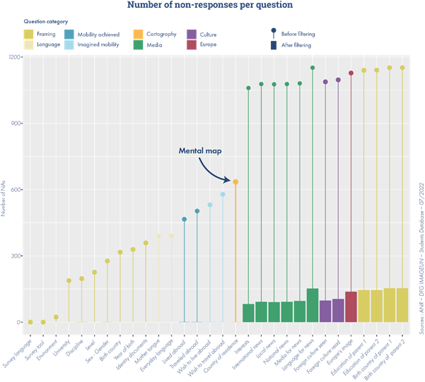 We carried out a thorough filtering of respondents. Only responses sent between 16 November 2021 and 30 June 2022, the official survey period, were retained. The various tests carried out during the collection period have been deleted. To enable the database to produce meaningful results, we removed respondents under two conditions: either if the mental map was not completed, or if the background data on the student was not complete enough (university not filled). The purpose of this filtering was to retain data that would allow for the joint analysis of socio-demographic and spatial data. The mental map question served as a reference point in this process, firstly because it was the key exercise in the study of geographical imaginaries in this survey, and secondly because it was located exactly in the middle of the questionnaire, allowing us to gauge the completeness of the data entry. This filtering once again highlighted the impact of unsupervised mental map questioning on the survey's completeness rate. In addition to filtering responses, we corrected several irregularities caused by the data collection tool and its current administration.