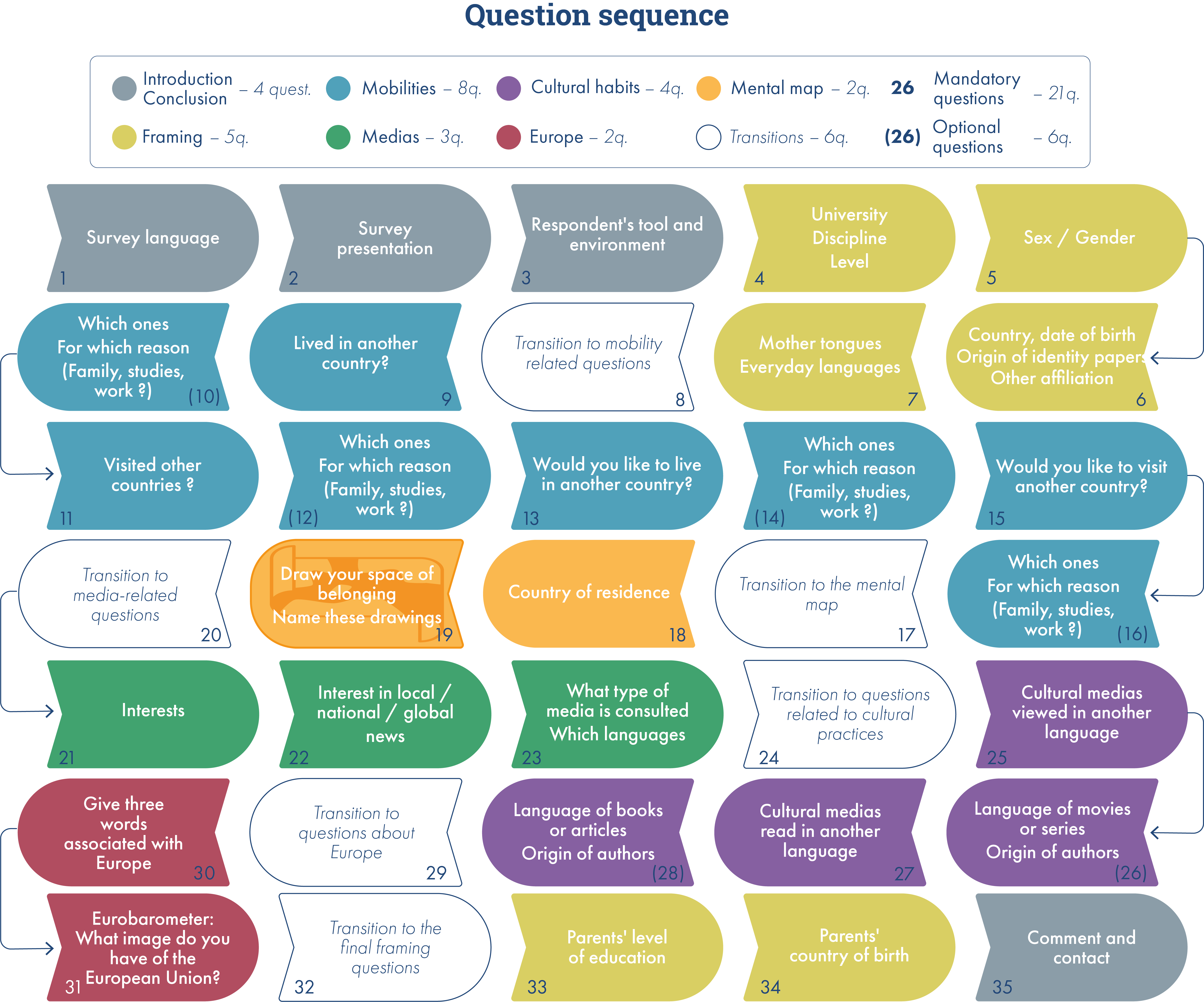 The questionnaire comprises seven thematic sections (Figure 1) designed to capture students' practices and representations of macro-regions and to collect data that can be compared with the other thematic areas of the project. Figure 1 shows each slide of the questionnaire given to students. In addition to the introductory, informational, concluding, and acknowledgment sequences, the questionnaire sought to understand both the practices and macro-regional representations of students, without limiting itself to the question of the spatiality of macro-regions. Thus, projections and realized mobilities, linguistic, media and cultural practices are considered as elements contributing to macro-regional imaginaries, in a socio-constructivist approach (Paasi, 2010). Each block represents a page, the corresponding section, its content, or the sorting questions used to adapt the length of the questionnaire as the student progressed, with the aim of making it as short as possible and avoiding dropouts. The questionnaire was self-administered and took between 10 and 25 minutes to complete, depending on the number of conditional sections (follow-up question) answered. Details of each section and a visualization of the complete survey are available on a dedicated website (Marveaux et al., 2024a). It presents the survey design and the process of constructing, processing and analyzing the database produced.