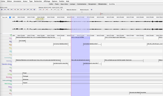 Figure 1. Interface du logiciel ELAN, extrait de transcription alignée et annotée