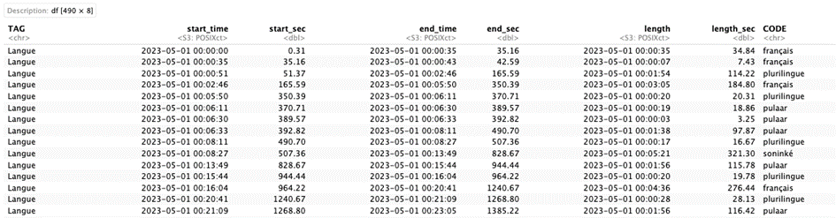 Si on prend les lignes du tableau ci-dessus, la colonne « TAG » nous donne la variable, et la colonne « CODE » nous donne la modalité de cette dernière. Les autres informations sont relatives au temps (début, fin et durée d’une séquence pour un CODE dans un TAG). Ainsi, sur la question de la langue, on peut obtenir l’ensemble des séquences pour chacune des langues parlées dans les réunions. De cette manière, on peut extraire des sous-parties du tableau afin d’observer les variables une à une : on peut ainsi déployer la plupart des outils de la statistique descriptive univariée.