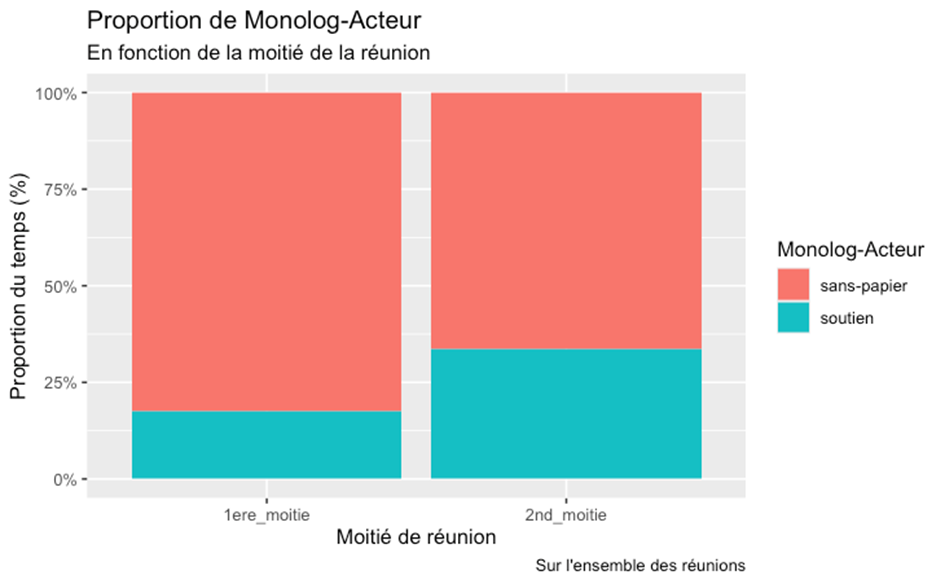 Ce résultat n’est pas si étonnant dans la mesure où les soutiens ont une conscience réflexive explicite de la nécessité de laisser la parole aux sans-papiers (voir plus haut et AUTEUR 2024). La prise en compte de la temporalité des réunions permet d’affiner, et de relativiser, ce constat.