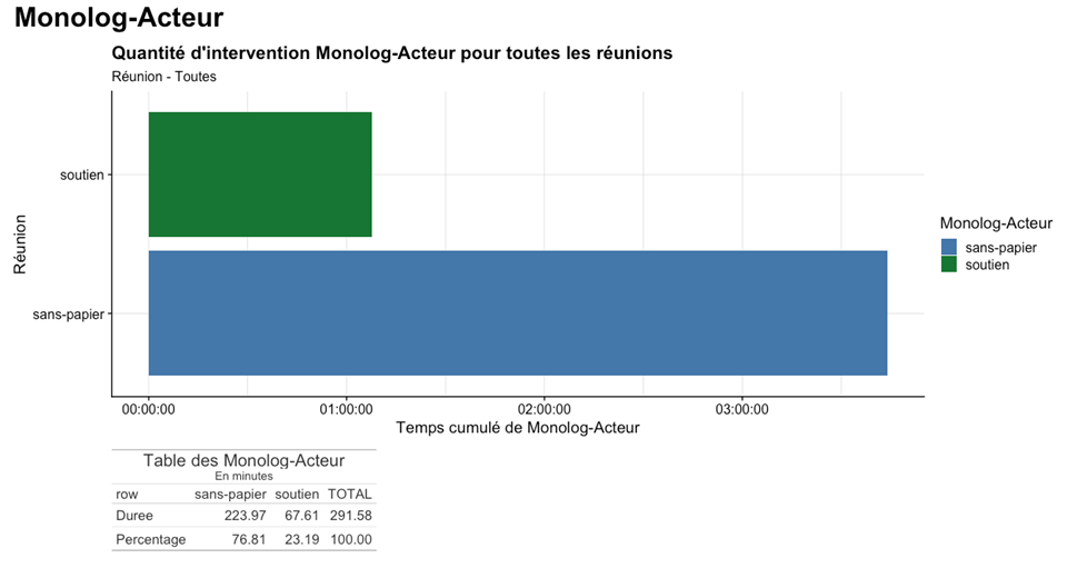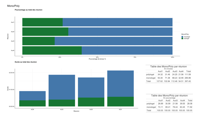 Pour représenter nos informations, il faut choisir entre les quantités ou la temporalité. Dans le premier cas, pour visualiser les quantités par modalité de variable, nous utilisons des diagrammes en barre pour représenter l’information. Sur les statistiques univariées, il s’agit soit de montrer les quantités, soit les proportions par réunion, ce qui permet de comparer la durée des modalités en fonction de ces dernières. On complète ces visualisations d’un tableau qui nous donne les durées pour chaque modalité.