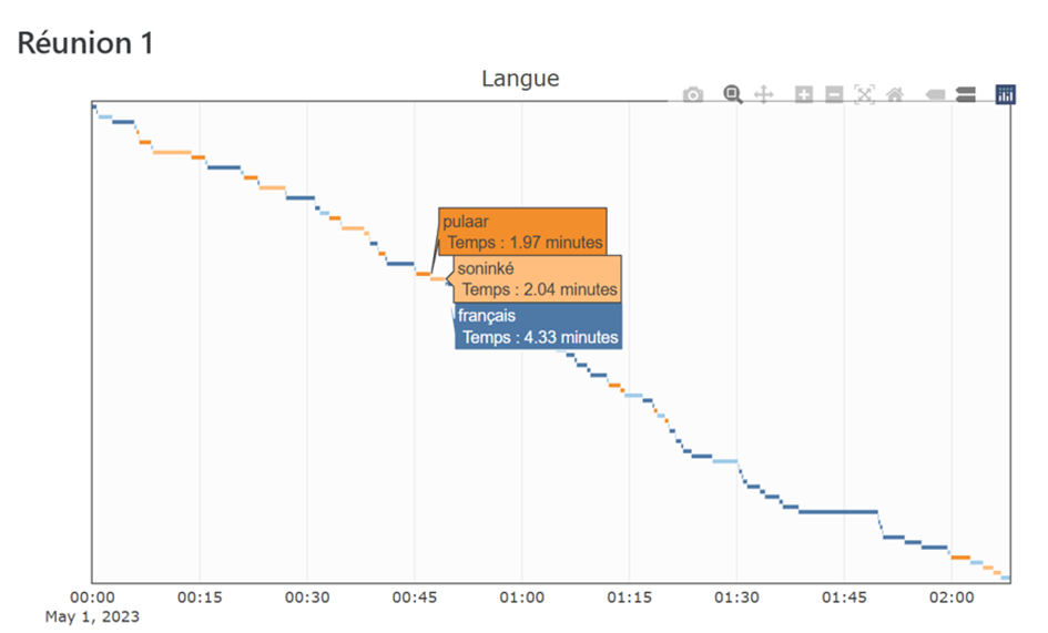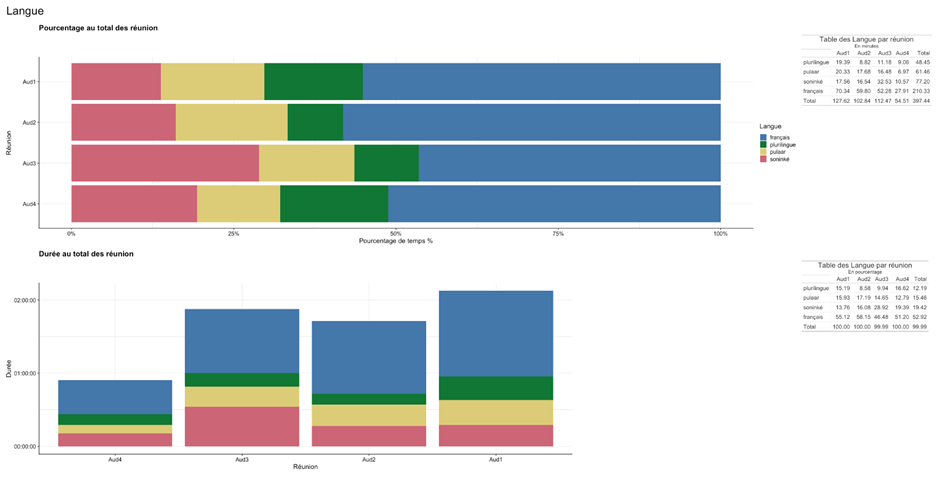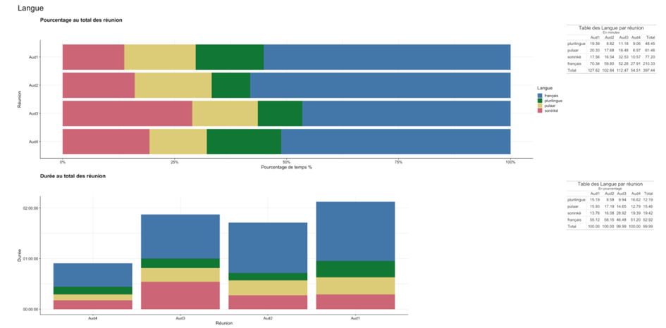 Le français est parlé 52% du temps de la parole monologale en réunion, le pulaar (16%) et le soninké (20%) représentent à eux deux 35%, le temps restant étant un temps plurilingue qui correspond à des moments de polylogues. Ces moments sont difficiles à annoter du point de vue de la langue puisque des schismes interactionnels (perte d’un foyer d’attention commun au profit d’échanges en petits groupes) peuvent émerger, dans d’autres langues que la langue du foyer d’attention, ceci dans l’une des trois langues officielles de la réunion, ou encore dans une autre langue.