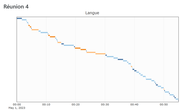 Fig 13 : Distribution temporelle du pulaar (orange foncé), soninké (orange clair), du français (bleu clair) et des sections plurilingues (bleu foncé) (réunion n°4)