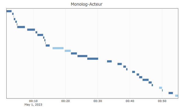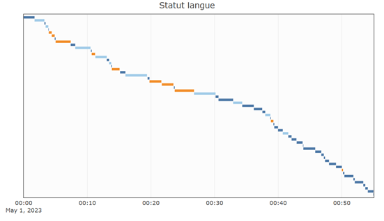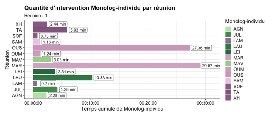 On peut aussi se servir du temps comme une variable à représenter dans nos graphiques, non plus comme une quantité, mais comme une durée. On peut ainsi s’intéresser à l’enchaînement des modalités dans le temps de la réunion :