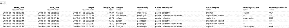 On comprend intuitivement la nécessité d’avoir une approche rigoureuse dans l’annotation des données en amont de la phase d’analyse pour ce type de manipulation : si l’on ne respecte pas une dénomination des modalités strictes, ou que l’on n’annote pas précisément les interactions, on se retrouve soit avec beaucoup de « nettoyage » des données, soit avec des informations erronées. De plus, le tableau fourni à l’origine n’est pas formaté pour permettre la comparaison des informations, nous devons le « pivoter » afin d’avoir en ligne les temps de l’annotation, en colonne les variables, et dans les cellules les modalités. Cela implique de découper le temps dans un référentiel commun pour chaque variable dans ELAN, et notamment de s’ajuster sur le découpage le plus petit.