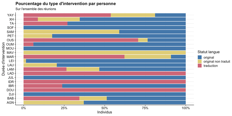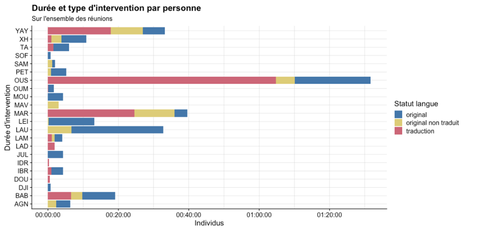 Ici, on peut représenter à la fois le temps d’intervention de chaque personne, mais aussi la tier STATUT-LANGUE associée à ce temps d’intervention (sur l’ensemble des réunions). En plus d’avoir l’information sur les personnes qui interviennent le plus souvent, on a également l’information de la nature de la prise de parole qu’elles utilisent sur ce temps d’intervention. On pourrait comparer la tier STATUT-LANGUE par individu avec des pourcentages relatifs aux individus, ce qui nous permettrait de mieux voir les types d’intervention par locuteur :