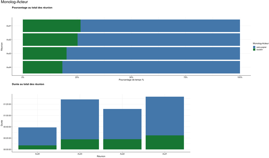 Les séquences monologales, catégorisées par les acteurs comme des « prises de parole », constituent entre 60 et 78% du temps de réunion, occupant ainsi un rôle structurant.