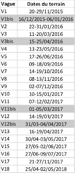 Nous produisons le fichier final àprès avoir passé ces trois étapes. Le jeu de données comprend au total 23 vagues, y compris des vagues « bis » identifiées par l’ajout de la lettre « b » accolée au numéro de la vague. Au cours de l’enquête, certains participants se retirent donc le rafraîchissement du panel est réalisé comme décrit dans la partie 1.2 (Tableau 7).
