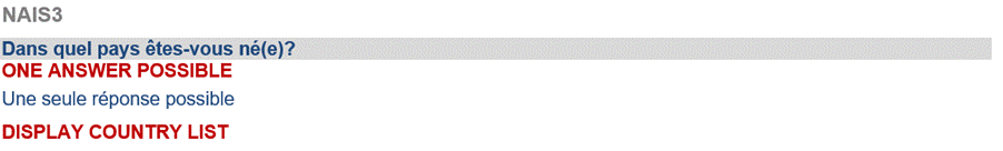 Nous avons appliqué plusieurs étapes de traitement à la base de données d’origine afin de la rendre plus exploitable. La base initiale était cumulative et comportait de nombreuses variables recodées, ce qui alourdissait considérablement le fichier. Au final, il y avait au total 2864 variables dans la base de données. Un travail de nettoyage et d’apurement des données a donc été indispensable avant toute documentation. Nous avons segmenté les fichiers selon les vagues de l’enquête et sélectionné les variables pertinentes pour la diffusion en vue d’analyses secondaires. Concernant le critère de sélection, nous avons gardé uniquement des variables d'origine et supprimé des variables recodées. Par exemple, les questions aux réponses en échelle, telles que la question Q0, ont été automatiquement recodées en sous-totaux, comme illustré à la figure 4. Ces variables recodées en “sous-totaux” ne figurent pas dans la base de données diffusée pour ne pas alourdir le fichier. De même, certaines variables sociodémographiques du questionnaire ne sont pas incluses, ou seules leurs versions recodées sont présentes. Par exemple, dans la vague 1, le pays de naissance n’a été demandé qu’aux personnes nées hors de France métropolitaine ou d’outre-mer (figure 5). Dans cette même vague, les questions sur le lieu de résidence principale étaient posées au niveau du département et de la commune (figure 6). La variable relative au pays de naissance n’est pas présente dans la base diffusée, tandis que les deux dernières sont disponibles sous forme recodée par région. Ces choix visent à préserver l’anonymat des répondants tout en offrant aux utilisateurs potentiels l’information la plus détaillée possible.