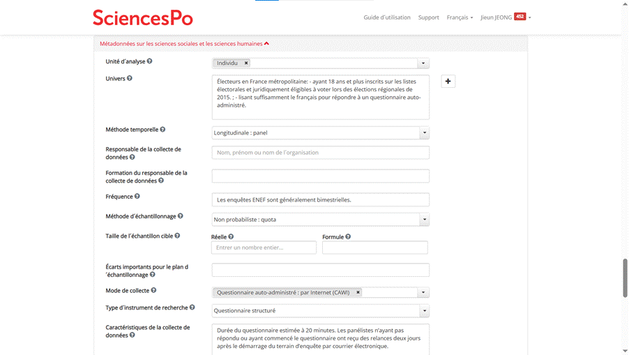 DDI est disponible dans un schème XML mais pour éviter d’écrire la documentation en XML, nous avons procédé en trois étapes différentes (Danciu & Sauger, 2022). Pour la partie documentation de l’ enquête, nous la saisissons directement sur la BDSP, en remplissant le champ librement ou en choisissant parmi les vocabulaires contrôlés (Figure 7). Pour la deuxième étape, le premier travail de la documentation au niveau variable se fait sur R, en même temps que l’apurement (Figure 8). Il s’agit principalement de corriger et ordonner les modalités de la variable en adressant un label pour chaque modalité. Ensuite, nous utilisons Nesstar pour finir la documentation qui permet de générer le fichier XML et le codebook (Figure 9).