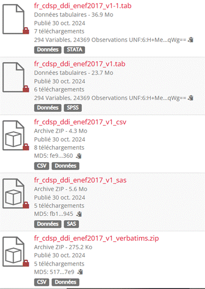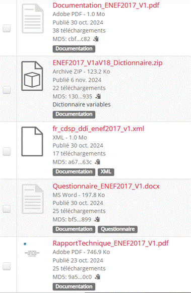 Chaque vague de l’ENEF 2017 possède son propre DOI. Chaque jeu de données est diffusé sous quatre formats : dta, sav, SAS, ainsi qu’un format csv accessible à tous les utilisateurs. Les réponses aux questions ouvertes sont disponibles dans un fichier distinct intitulé « _verbatim » le cas échéant (Figure 10). Les fichiers de documentation sont fourni par jeu de données, incluant un codebook au format pdf généré par Nesstar, un dictionnaire des codes, le questionnaire de l’enquête et un rapport technique présentant la distribution selon le redressement et l’échantillonnage. La documentation DDI est également disponible au format XML afin de garantir l’interopérabilité avec d’autres standards et la réutilisabilité. (Figure 11)