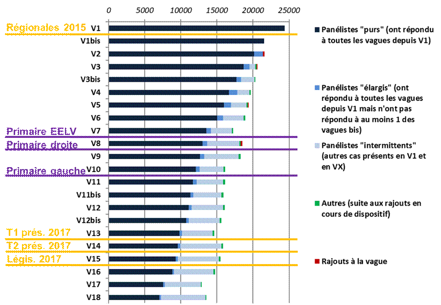 La collecte des données a été réalisée par IPSOS avec la méthode CAWI (Computer Assisted Web Interviewing). Le terrain d’enquête s’est déroulé sur 18 vagues principales et plusieurs vagues intermédiaires spécifiques, de novembre 2015 à mai 2018. L’analyse de la construction des opinions sur le temps long, dans le sens d’un temps d’observation étendu couvrant plusieurs scrutins successifs (Le Hay, 2017 ; Muxel, 2018), est une des spécificités marquantes de cette enquête. Cette temporalité étendue a permis de suivre différentes élections : les élections régionales de 2015, les deux tours de l’élection présidentielle de 2017, les élections législatives de 2017. Il a ainsi été possible de couvrir différentes périodes préélectorales, les formations des intentions de vote pour chaque scrutin, les phases de primaires précédant l’élection présidentielle, tout en mesurant l’évolution de l’espace idéologique des personnes interrogées ainsi que l’entrée dans le possible électoral d’une nouvelle génération de primo-votants.
