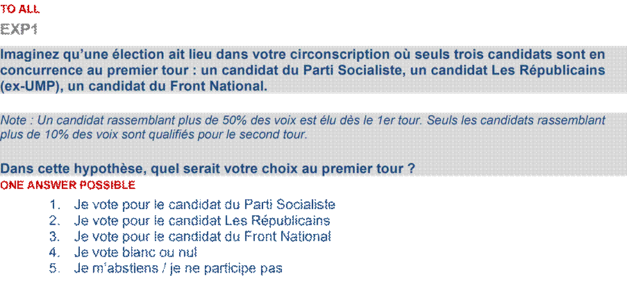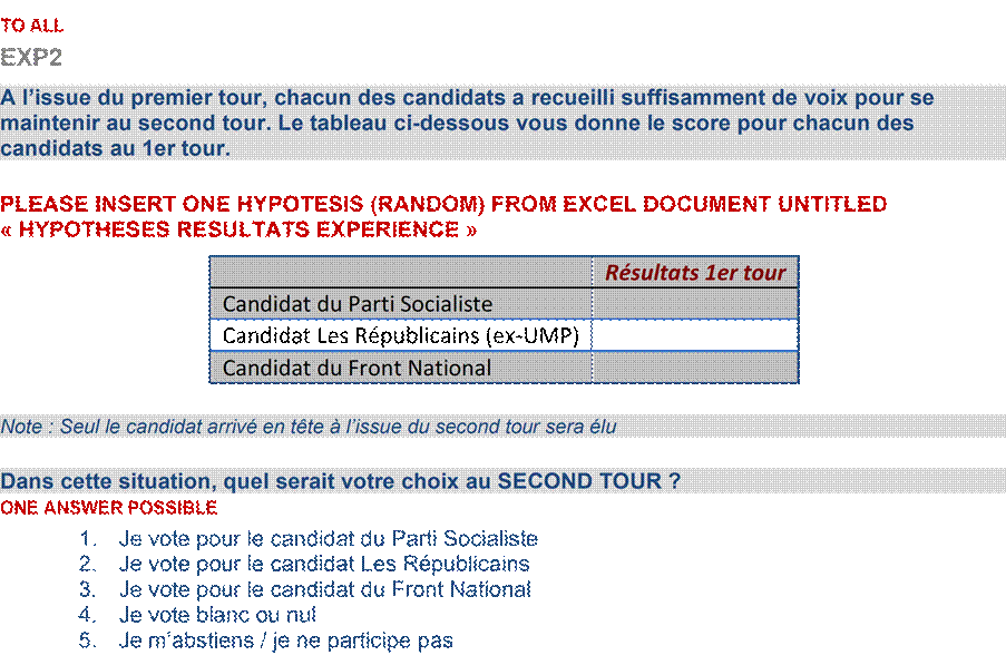 Un point relativement nouveau dans les enquêtes électorales françaises est le développement de nombreuses expérimentations tout au long du dispositif. Les vagues d’enquête ont intégré ces dispositifs expérimentaux pour tester des hypothèses sur les comportements électoraux et en particulier sur deux thématiques : le vote stratégique ; l’évaluation de l’exécutif et son usage du 49.3. Ces expérimentations ont permis de produire des données originales, particulièrement précieuses pour comprendre les déterminants des choix électoraux et les dynamiques d’opinion. Un des premiers exemples d’expérimentation propose des scénarios électoraux hypothétiques pour analyser les réactions des panélistes face à une configuration de triangulaire entre le Parti Socialiste, Les Républicains et le Front National (devenu le Rassemblement National par la suite) dans le cadre d’un scrutin législatif et évaluer la réaction de ces mêmes panélistes sur le second tour du même scrutin en fonction des résultats hypothétiques du premier tour. Cette expérimentation vise donc à analyser à la fois les préférences de vote initiales des électeurs et leur comportement stratégique au second tour.