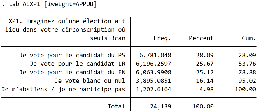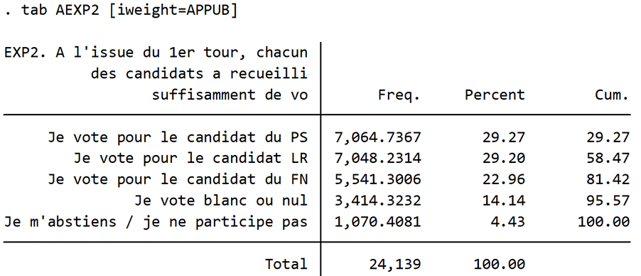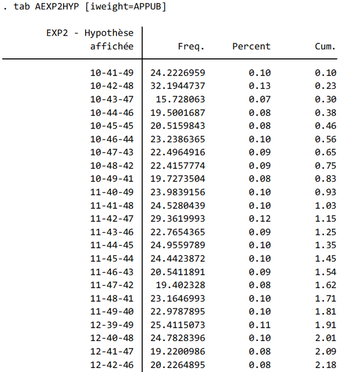 Tableau 5 : Extrait de la distribution des hypothèses de résultats du premier tour affichées avant la mesure de l’intention de vote potentielle sur le second tour en découlant, vague 1, données pondérées par la pondération “décision” combinant redressement sociodémographique et politique (code en STATA)